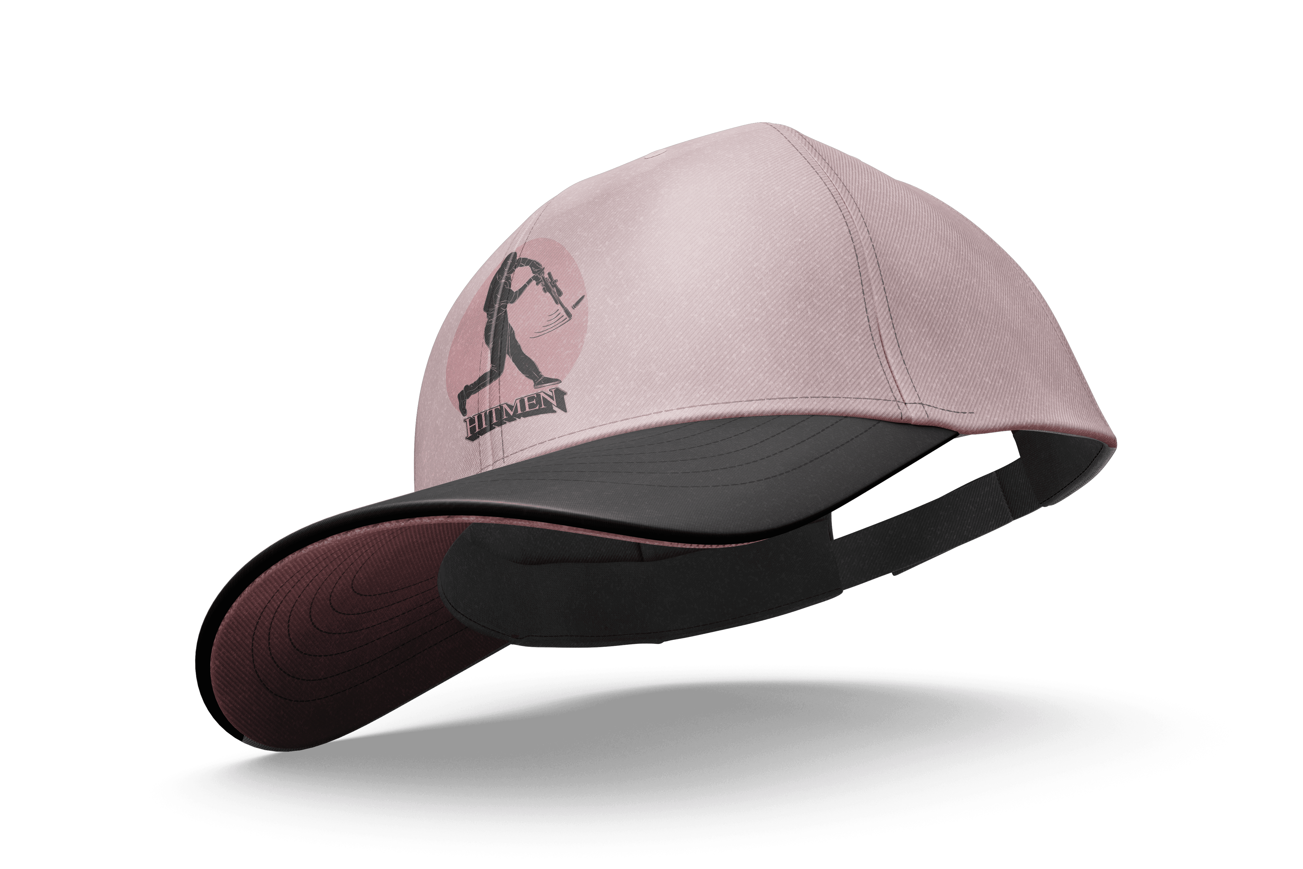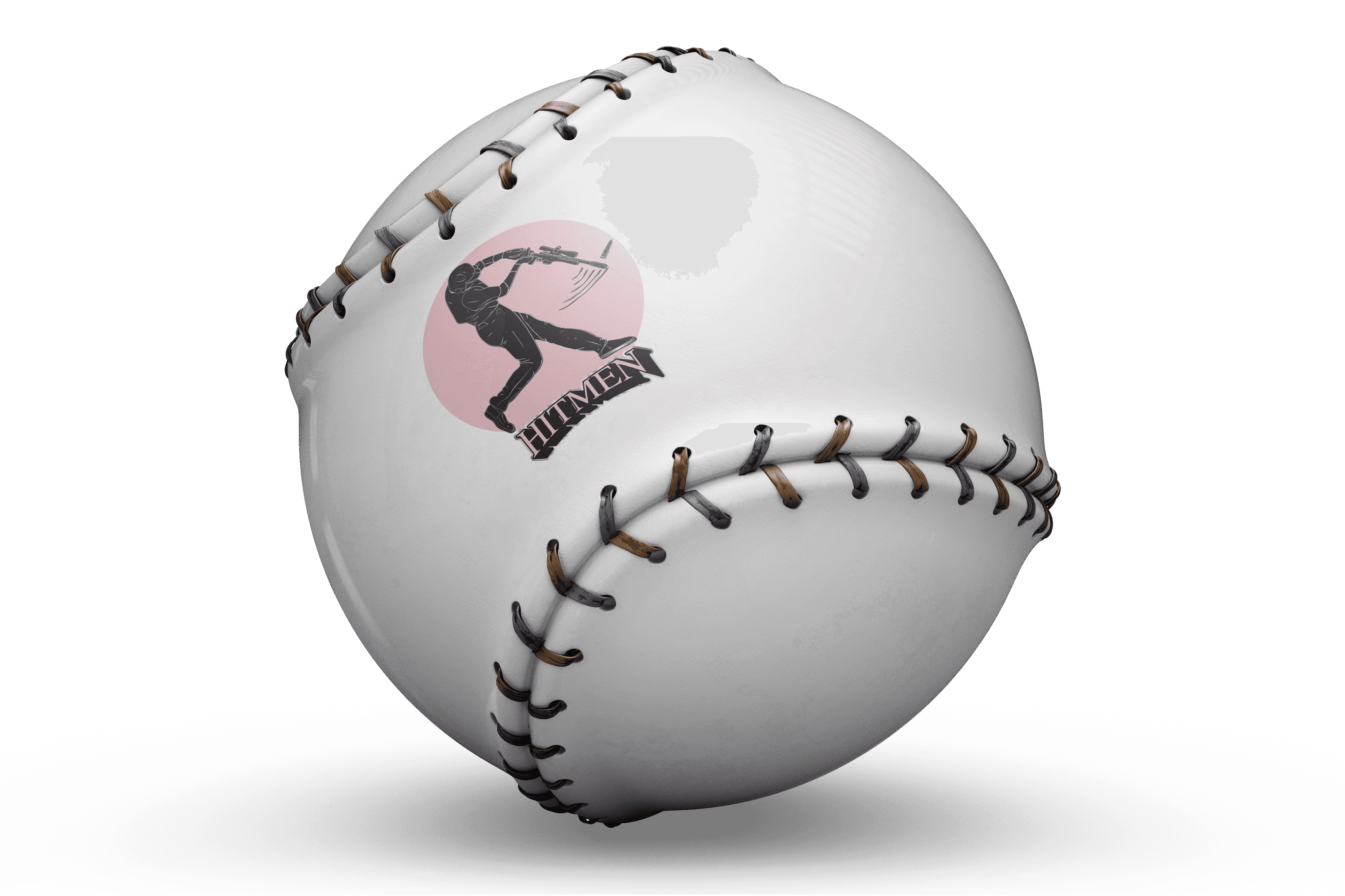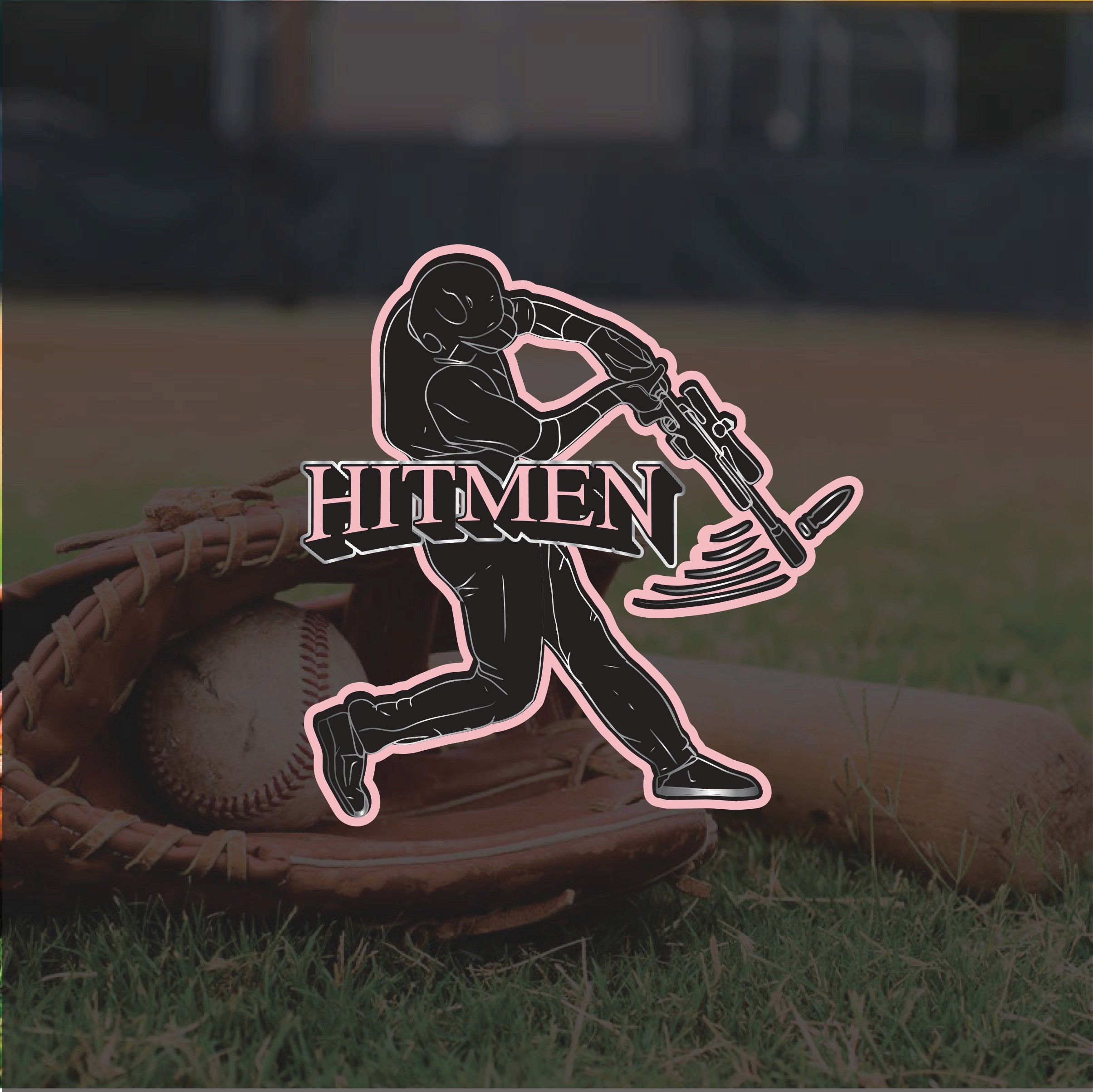 Bold and aggressive branding for the Hitmen baseball team, featuring a dynamic masked figure wielding a bat. The dark, edgy design contrasts with a soft pink backdrop, while sharp typography reinforces the team’s fearless identity.