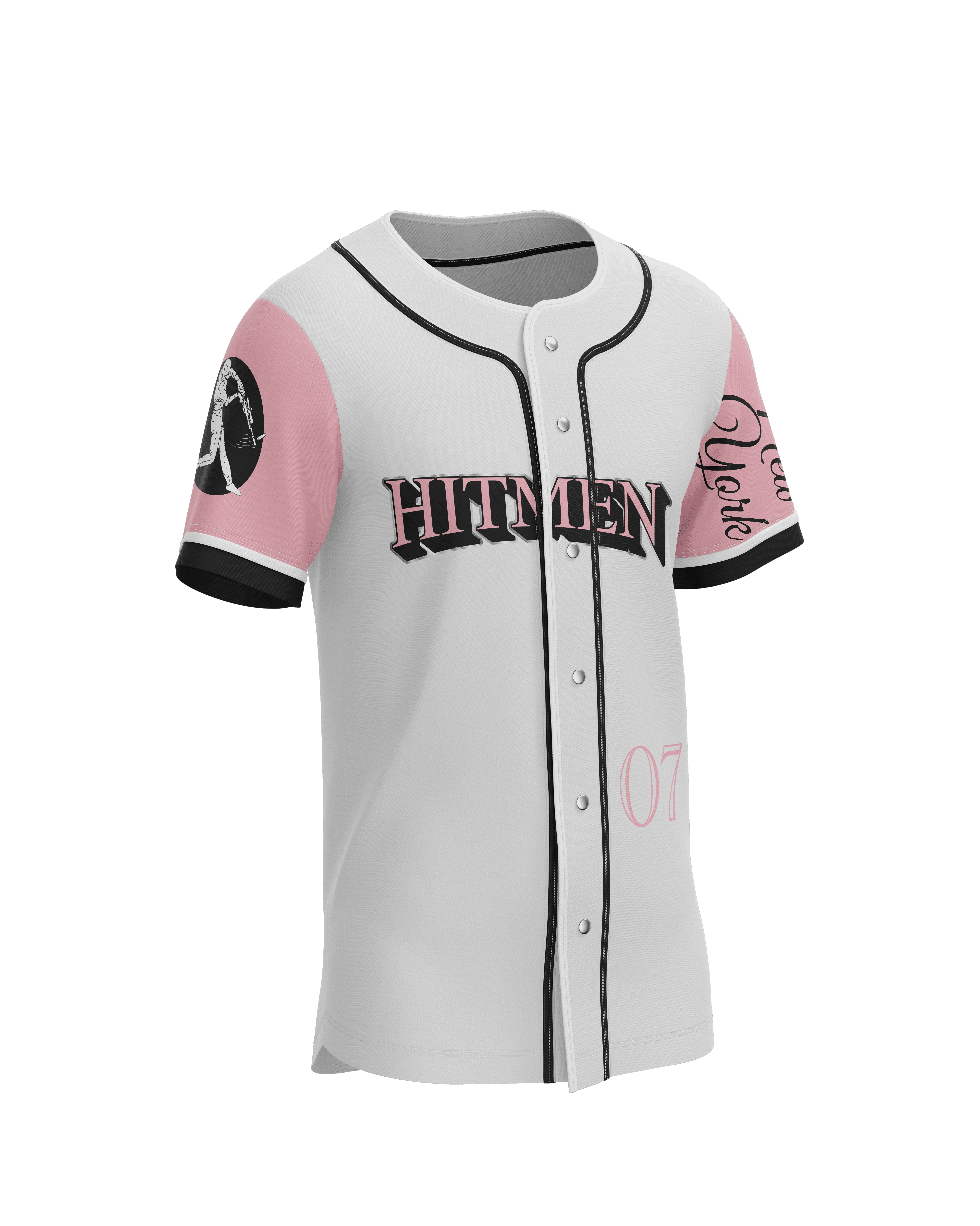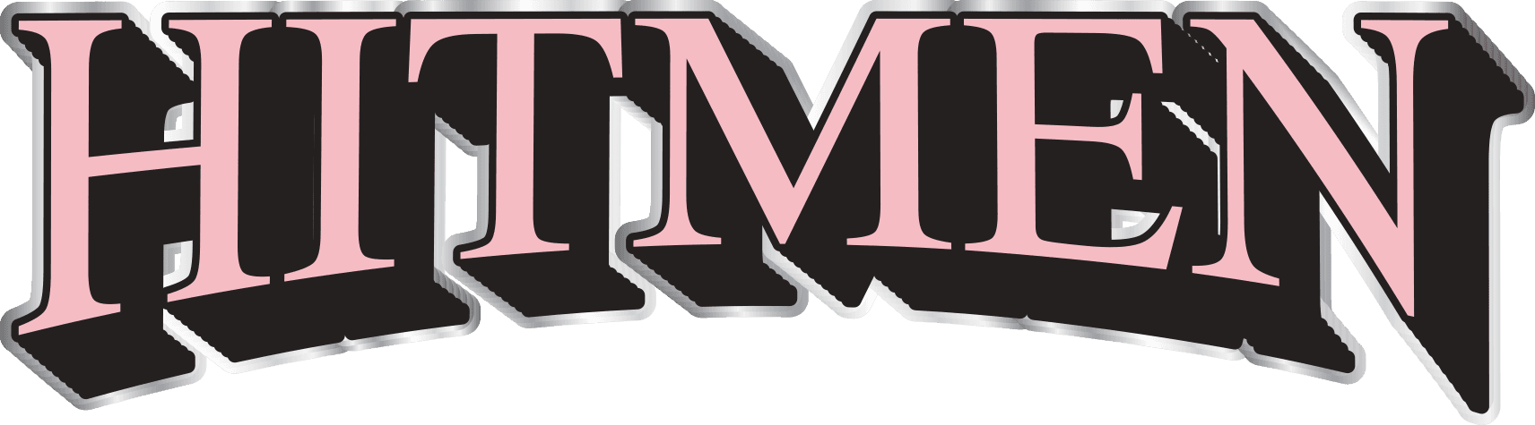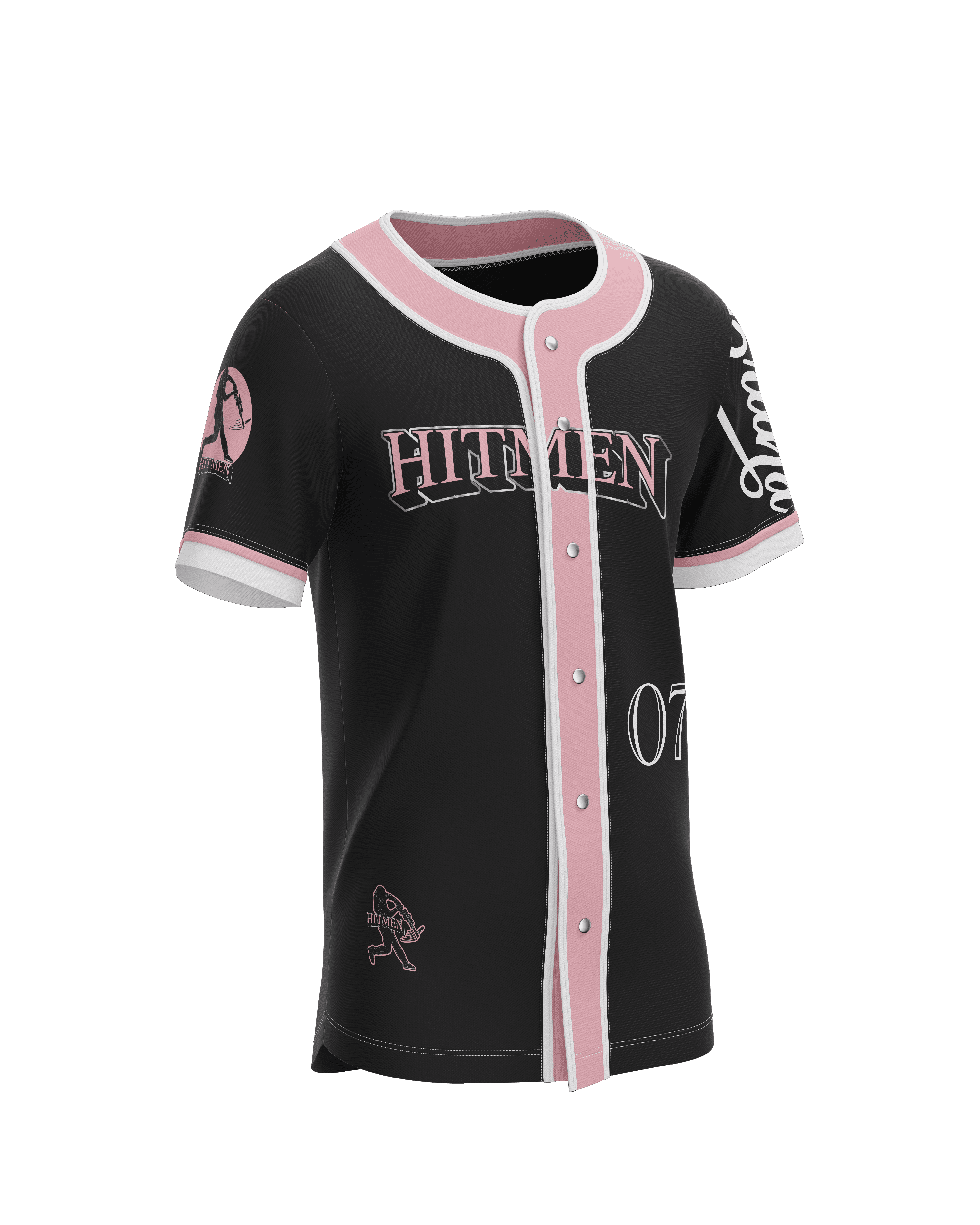 Bold and aggressive branding for the Hitmen baseball team, featuring a dynamic masked figure wielding a bat. The dark, edgy design contrasts with a soft pink backdrop, while sharp typography reinforces the team’s fearless identity.